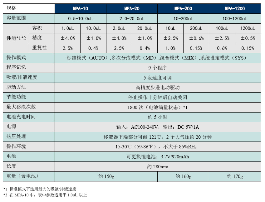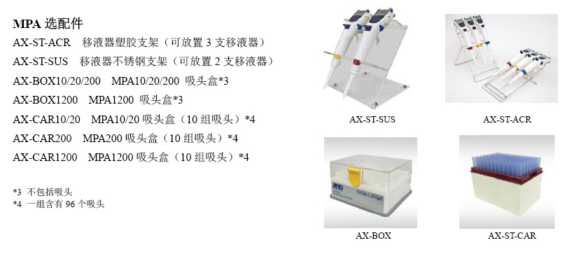 ●逆向操作模式,为适用于粘性大、浓度高的样品吸取比目标容量稍大的容量,自动根据设定的目标量排放,余下残液弃之不用,这样可确保排除量的准确性。手指按键操作:友好的用户使用计,手指轻按操作键即可进行移液操作,降低手部重复性劳损。提高移液效率:快速吸头安装,密封性好,无需手动紧压吸头。手指轻按前置释放键轻松去除吸头,做到无污染吸头,清洁的工作环境,自动化原材料处理,带给你更多手动移液器无法满足的移液体验。5档速度可选:MPA可根据需要对吸液、排液速度进行调节,可选5档速度,满足你各方面的需要。存储功能:可存储9种移液程序,转换不同样品时操作简单快捷显示屏防冲击设计:LCD显示屏边角防护设计,有效减少跌落时带来的损害。内置锂电池,USB快速充电:左侧有USB接口,允许边充电边进行移液操作。电池满电状态下可以连续使用1800个移液循环。省电设计,自动断电功能,方便不用时无需人为操作即可关电用户校准功能:为了确保测量分析的准确性,移液器常常需要校准。用户可选购A&D配套检测设备随时随地对移液器进行校准,而无需送专业检测机构即可完成校准工作.MPA还可以修正不同吸头差异因素,因此市面上大部分的吸头都可适用于MPA系列。重量校准:MPA除可以以容积单位(uL)校准外,还可以以重量单位(mg)进行校准。这样对于配备一些固体、粉末的稀释液需以重量计算,或者测量高粘度样品时变得相当简便快捷,同时重量校准就会让实验结果更加精确。